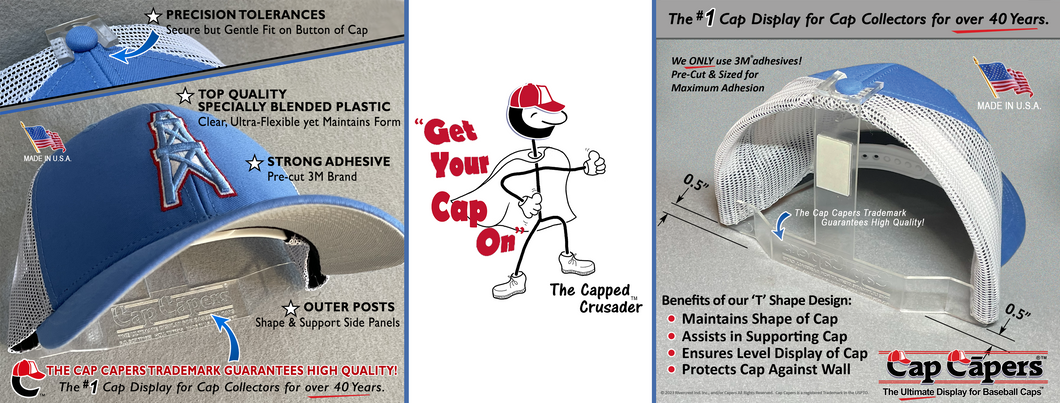 Cap Capers provide a way to exhibit a baseball cap in a neat, organized fashion while keeping the cap property shaped. Each Cap Capers holds one baseball cap individually and allows absolute versatility in display arrangements.