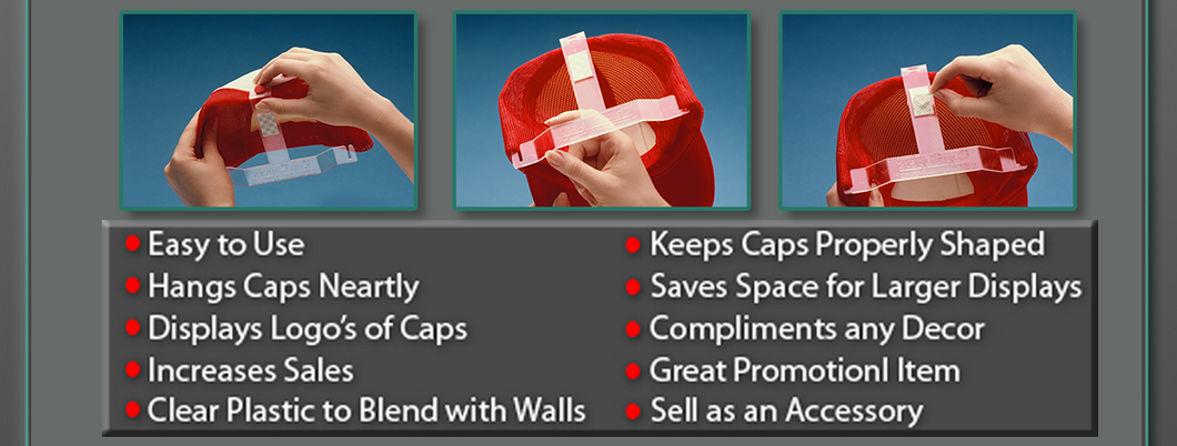 With Cap Capers, a collection of caps can be displayed in a way to compliment the decor of any showroom, sports bar, restaurant or game room. Cap Capers aid in creating a highly attractive and accessible retail store display or convention… meaning better cap sales!